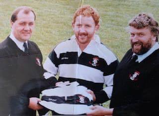 Tam is pictured with captain Micky Hunt and President Tally Johnstone.